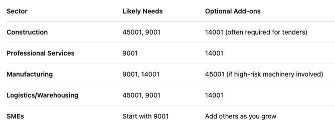 Ensures you’re identifying and controlling health and safety risks. Critical in sectors like construction, manufacturing, logistics, and engineering.